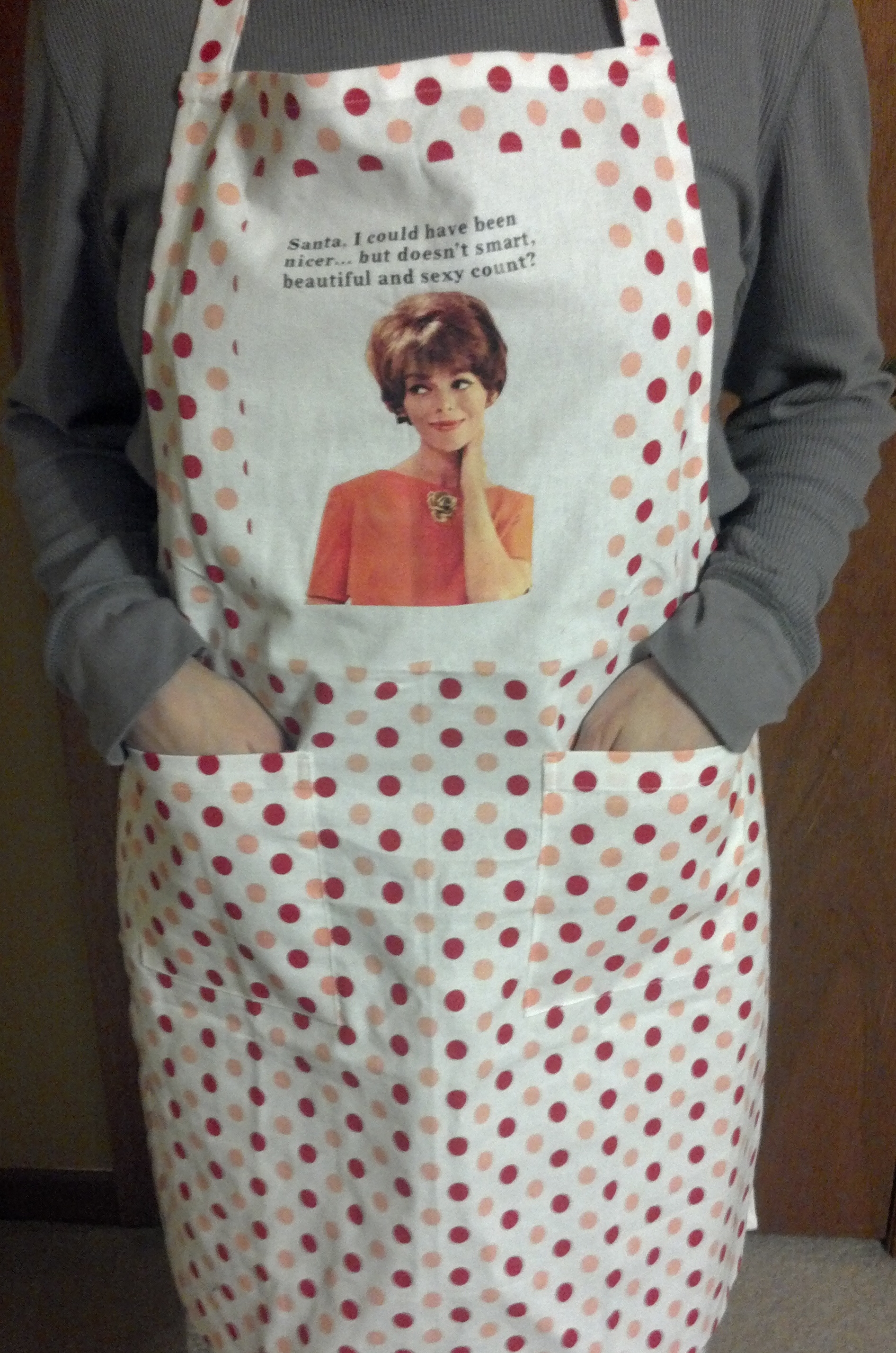 Most people who know me, know that I have the ability to mess most everything I eat, cook, heck sometimes even what I just look at, on myself!! So…….receiving an apron is like an extra special gift to me, especially with Christmas baking, cooking, etc. coming up. This apron has red and peach polka dots and says, “Santa, I could have been nicer… but doesn’t smart, beautiful and sexy count?”. The ties for around the neck and waist are long enough to fit most sizes. In addition, in the front, there are two handy pockets.