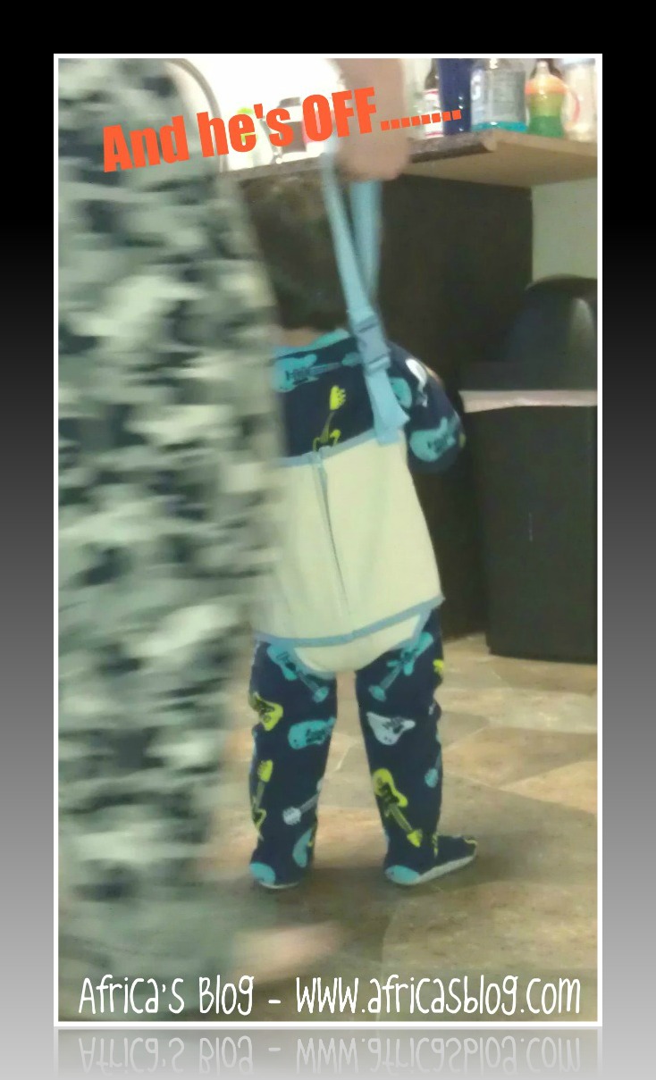 The Juppy is made of durable and CLEANABLE fabric. So easy to use, it goes on just like a pair of pants, with a zipper in the back to fit baby nice and snug! There is a lining inside I found by ‘accident’ to be quite waterproof. The Juppy is compact and fits in your purse, unlike the big wheeled baby walkers.