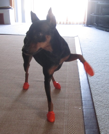 I never, for a minute, thought my dogs would wear doggy booties!! If they got anything on their paws they were instantly freaked out and kept that paw up in the air until it was removed. This made me sad as I really wanted to get them into booties so going outside to potty in the cold Minnesota winters wouldn’t be so cold and miserable as the ice and snow pushes up into the pads of their paws.