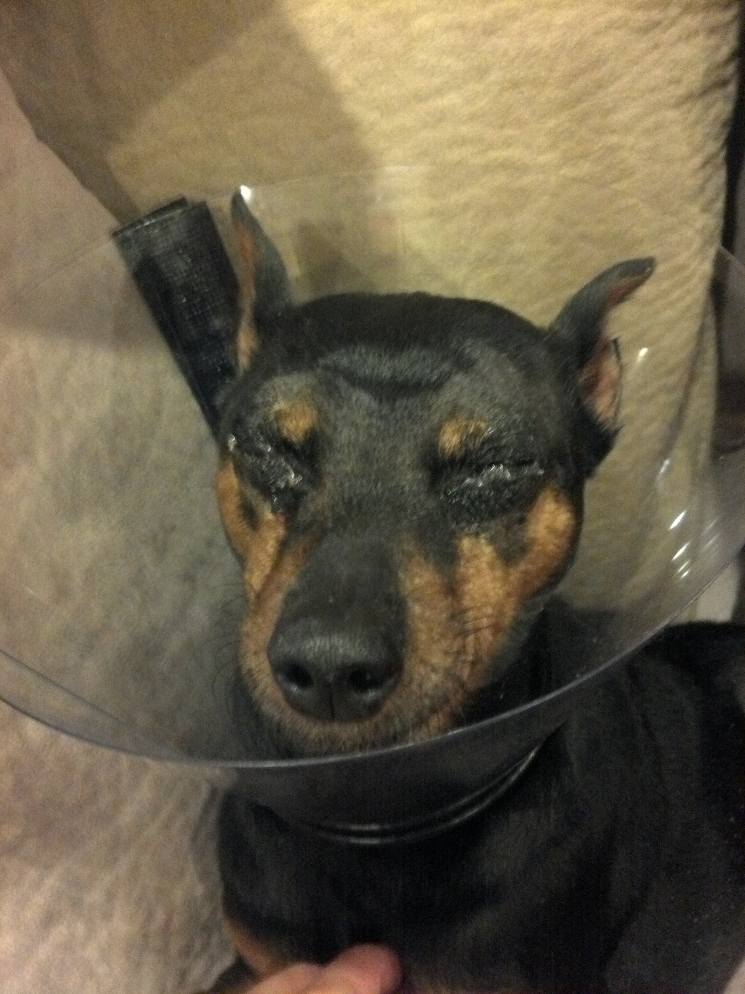 We are able to see the pupil in his eye and the brown part of his eye now, before it was all clouded over!!! So it is exciting and encouraging news!! Just want to be able to take the cone off!! Hopefully soon!!
