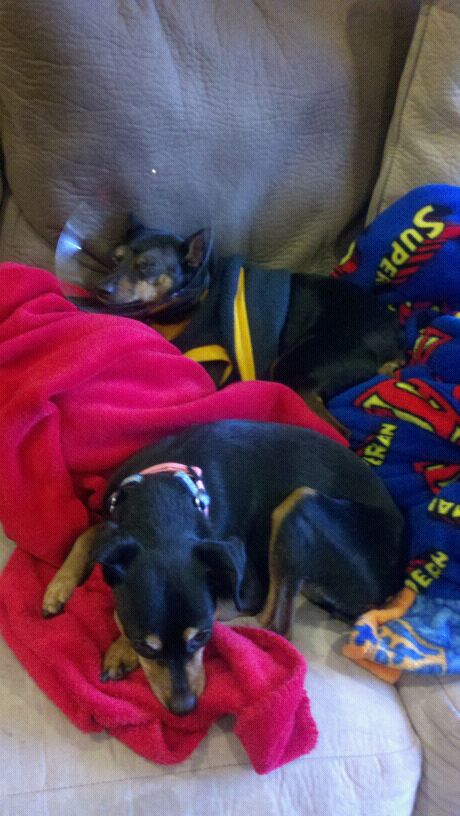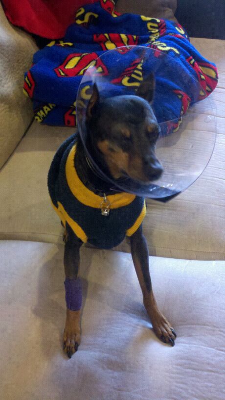 Aww, poor baby! I have a min-pin as well, and I know how you feel about your dogs being your children! Min-pins are known for having eye issues. My 12 year old, Alexis, has had a big white dot on her eye since she was about 3. The vet said it was just fat (??) in her eye and could stay there forever, or float around. It hasn’t moved in 9 years, and now her other eye has one. It doesn’t seem to have affected her in any way though, so far. Praying she won’t develop anything worse with her eyes. We found out last year she is a diabetic though, so she gets 2 insulin shots a day. I pray your Mr. Tanner recovers quickly. He is a adorable!!