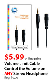This nifty Volume Limit Cable Control works on any headphones, thereby creating the same KidzControl feature. Lowering the maximum audio playback from the devices your children are listening to, if they are not using the Kidz Gear branded headphones.