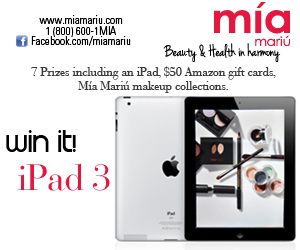 Mia Mariu wants to give you an iPad! Get to know Mia Mariu on Facebook for your chance to win an iPad 3 16GB with personal engraving on the back. Check out Mia Mariu’s Botanical Skin Care line, Nutritional Supplements and Mineral Makeup products. Three lucky winners will receive a Mia Mariu Cosmetic Collection valued at $100 and three more winners will receive $50 Amazon Gift Cards! That’s a total of seven chances to win!