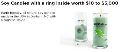 About Diamond Candles: They are Earth Friendly, all natural soy candles made in the USA! Within EACH candle they sell is a ring wrapped in a special foil pouch. The ring is worth $10, $100, $1000, or $5000! All you have to do is use the candle until it burns down to the ring and you’ve got your surprise! This is like the surprise in Cracker Jack boxes but much better.