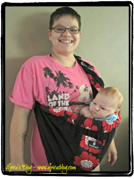 When carrying your little one in ANY sling/carrier it is of vital importance that you read all instructions and follow them, you always want to make sure you keep baby safe!! The instructions that come along with the Balboa Baby adjustable sling are very easy to follow and as you can see in the picture above Mr. Blake’s face is safely outside of the sling and he enjoying just ‘hanging’ out with his Aunt. The Balboa Baby slings have covered elastic trim that helps ensure baby is safe and close to you.