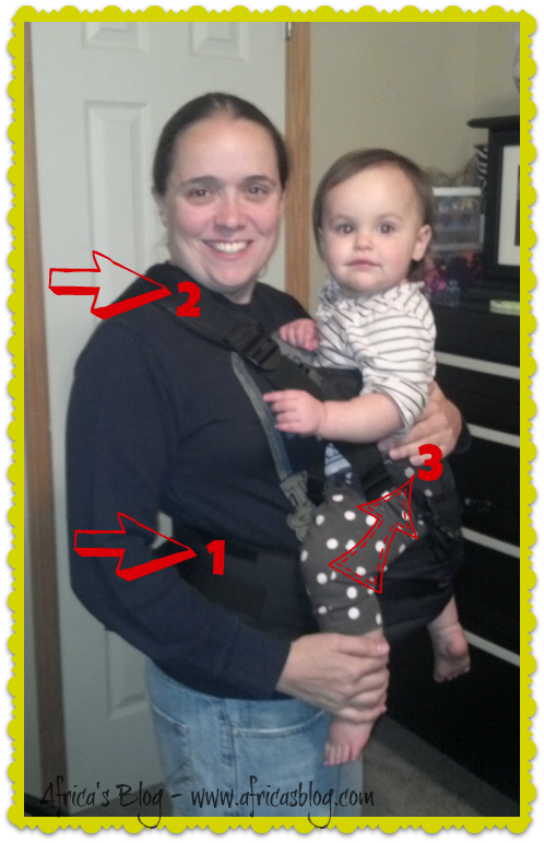 We all know how your back feels after you carry your little one for a while on your hip……it HURTS 🙁 well the Baby Nari Hip Hugger is designed to alleviate this problem – to help with that strain on your back, and it works fantastically. As you can see in the picture above, the arrow pointing at #1 is pointing out the strap that fastens with velcro around your waist. The tighter you make this strap the more comfortable this carrier is. An added bonus to this strap is that there are compartments within it to store you phone, keys, cards etc so you don’t have to carry additional items when you’re out and about running errands with your little one. #2 is pointing at the comfortable shoulder strap which comes with the infant option of the Baby Nari which then attaches to the hip hugger and provides additional support at #3 for babies over a year and 22 lbs, like Ms. Elliot.