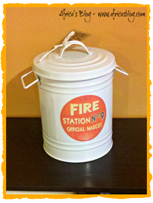 I chose the Fire Station No. 9 Treat Bin first because of its color. The cream colored powder-coated finish bin with the orange Fire Station No. 9 graphic goes just perfect with the walls and it doesn’t show what’s inside. Second, I chose the bin because it’s metal! It is way easier to clean and NOT BREAKABLE… so far! 🙂