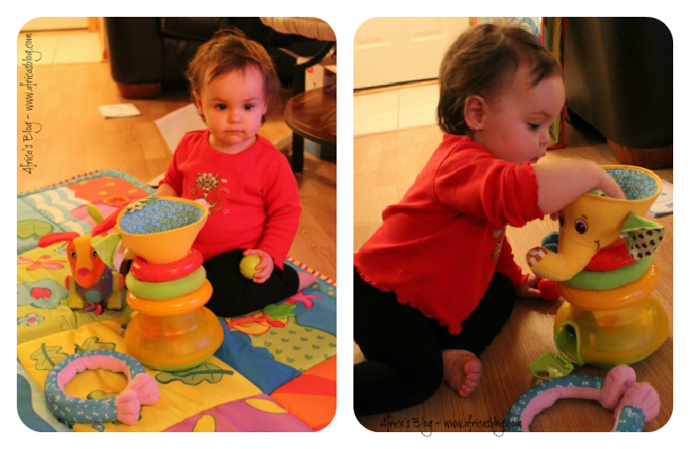 I could barely get the Tiny Love Musical Stack & Ball Game Elephant out of the box before Ms. Elliot was having a great time playing with it all. There are truly so many ways to play with this toy that encourages your child’s development, it is great!! First off I took the entire game apart and helped encourage Elliot to put it back together, she did a pretty good job, I was impressed 🙂
