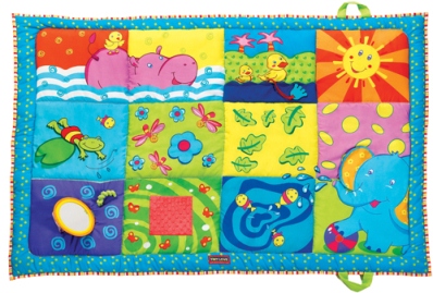 All I have to say about the Tiny Love Super Mat is summed up in one word – AMAZING!!! As the holidays are upon us and we travel around to visit family and friends this is a great play accessory to take along with you for your little ones entertainment. The Super Mat can be used indoors or out, the back of the mat is waterproof should you put it down in grass etc.
