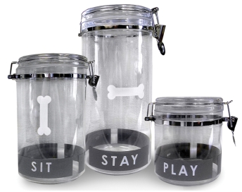 Along came the Petmate Treat Jar, a clear plastic jar with an AIRTIGHT lid that not only keeps the treats fresh and soft, it keeps the smell in! Petmate has three different sizes each with a fun command on the bottom: SIT in 34 oz, STAY in 67 oz, and PLAY in 91 Oz! All can be found on Amazon starting at $9.99.