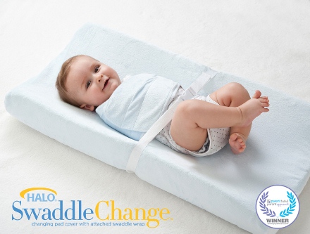 Now onto the all new Halo SwaddleChange and why it has made diaper changes so much easier when we’re lucky enough to babysit little Mr. Blake. Little ones are sure good at squirming, and moving around!! This is never more noticed then when I am attempting to change a diaper. The SwaddleChange is a cover for your changing pad (fits most contour changing pads up to 17″ x 34″) with an attached swaddle wrap, that you can adjust to fit your baby and that will keep your little one snug, safe and makes your life EASIER!! As you can see in the image below there is also an additional strap to add extra safety for your little one as they lay on their diaper changing pad.