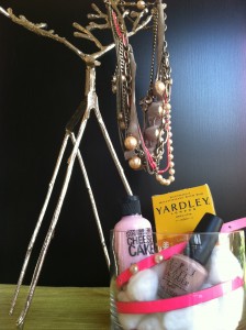 The total value of the Gift set is $215! It includes a J. Crew Chunky Pearl Necklace, J. Crew Fresh Water Pearl Earrings, and a J. Crew women’s skinny leather belt! Also included is Yardley soap, OPI nail polish, and Strawberry Cheescake Lotion. The vase is included, the reindeer is not.
