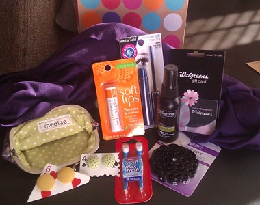 The clutch is filled with everything a girl needs for a night out … a compact mirror, lip gloss, mascara, wisp, hairspray, Walgreens gift card