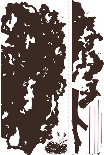 As you can see the decal is a chocolate silhouette of children on tree swings. The color matches the furniture perfectly! Even with the 10 different decals, after the first few pieces were placed onto the wall and moved and moved and moved until finally we got the positioning just right the rest was a breeze! The stickers are still on the wall a week later with not peeling up on the edges (I was worried because we moved the first few a LOT!!) The giant wall decal came on two different sheets with numbers on them so it made it easier to put the tree together in the correct order (see image below). After it was all up and placed ever so perfect it measures about 3 feet by 3 feet!