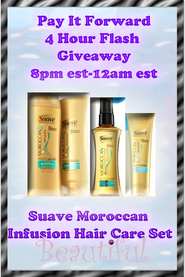 One lucky winner will receive this Suave Moroccan Infusion Hair Care Set! The winner will get shampoo, conditioner, styling oil, and shine mask.