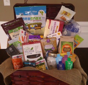 This basket is filled with Gluten Free treats, Almond flour, cave man cookies, sea snax, fresh pressed coconut oil, gluten free snickerdoodles, in the raw Sea crackers, Protein Shaker Bottle, Vega one nutritional shake, packet of Greens Superfood, 2 pre work out energizers, whole mega fish oil sample, immune perfect samples, 1 Calm anti stress drink, one a day samples, kids calm multi, and organic bottle wash.