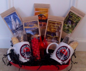 This Gift Set is valued $50. Included is 5 bags of 100% organic, 100% fair trade micro-roasted coffee (African sunrise, school house blend, nightfall, gorila in the mist, market, and full sail), 2 coffee mugs, red coffee scoop, chocolate biscotti,and apple red candy.