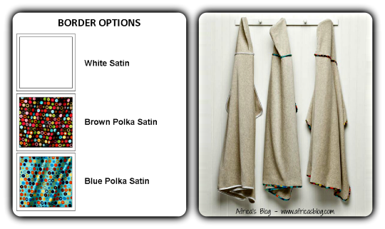 The antimicrobial hooded bath towel in the infant size is recommended for 0-9 months and is 30″ x 30″ with the hood placed on the corner to allow for the most coverage on your little one. The towel is made from 30% Argent 47™ antimicrobial silver yarn, 36% organic cotton and 30% polyester. The towel comes in oatmeal-silver and you can choose the color of the border – either white satin, blue satin polka dots, or brown satin polka dots, take a look at the color options below.