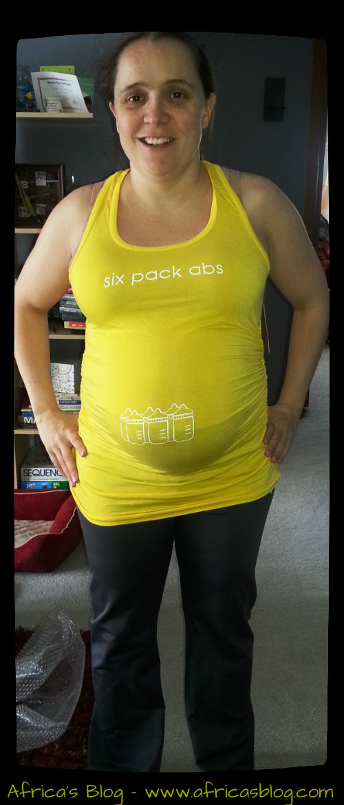 I was lucky enough to receive two fantastic items for review from For Two Fitness; the Six Pack Abs Racerback Tank Top and the Perseverance Maternity Workout Pants. Below is a picture of me wearing the items I received;