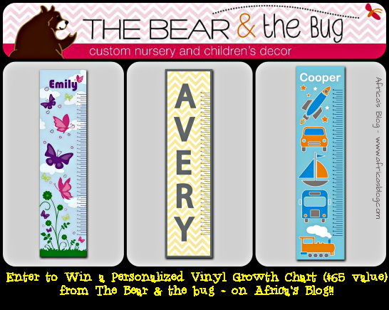 NOW – I am extremely happy to let you know that the fantastic people over at The Bear and The Bug have been kind enough to offer a lucky reader of Africa’s Blog the chance to WIN a Vinyl Growth Chart (either one available on their website or they’ll custom make yours like they did for me) – that’s a $65 value. Just enter via the rafflecopter entry form below.