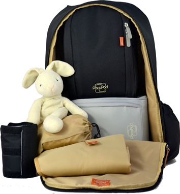 As explained above the PacaPod line of diaper bag products features the unique 3 in 1 baby organization system. I will be the first to admit that any additional help I can get when it comes to organization I will gladly take – I am not the most organized person 🙂 . As you can see in the picture below the Picos Pack comes complete with the feeding and diapering/changing pod. As seen in the demonstration video above, you’ll see that the diapering pod has space enough to store a few diapers, wipes, lotion and a diaper changing pad that is easily stored in the back of the pod. The feeding pod can easily fit a few bottles, including an insulating pad that keeps a bottle cold, or warm. Once your little one has moved onto eating solid foods you can store multiple containers of food within the pod.