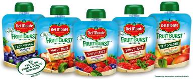 The newest product to the incredible Del Monte brand are the Fruit Burst Squeezers These amazing little packages of deliciousness have 1 1/2 servings of fruit or veggies and fruit per pouch! These USA made products are a great source of vitamins A and C. In addition, Del Monte Fruit Burst Squeezers contain no artificial flavors or high fructose corn syrup.