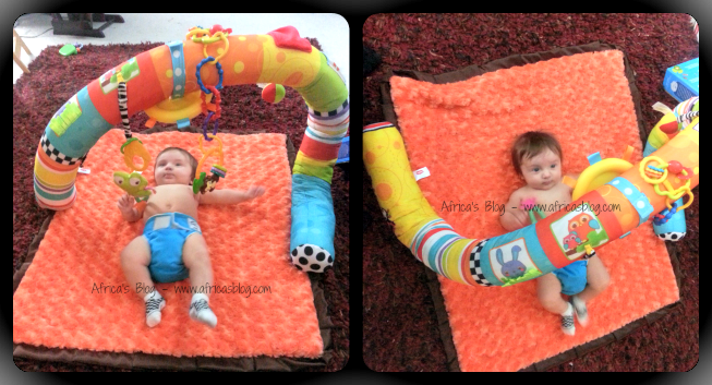 As you can see, in the video, the Flexi Play can be positioned in numerous ways, you can move the attached toys to different locations, and I even added a couple extra items, which was easy to do and Gradie just loved playing with it. You adjust the positions as your little one grows and is able to do different things, sitting, crawling, etc.