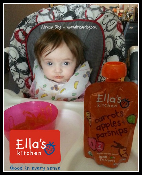 I received an assortment of Ella’s Kitchen 1 baby foods. These foods are designed for little ones 4 months and older. At around 4.5 months, right around Thanksgiving, we decided to have Gradie start on some solids. Just take a look at how cute she looks in her high chair, waiting to try some yummy Ella’s Kitchen carrots, apples, and parsnips.