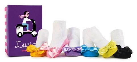 How about this gift box of Lucia Big Bow Socks, which comes with 6 fun colors to match every outfit 🙂 . When our little ones are this small we don’t always need to put them in shoes, that’s why I love the Lucia Big Bow Socks, they make it look like Gradie has shoes. Just look at the cuteness below;