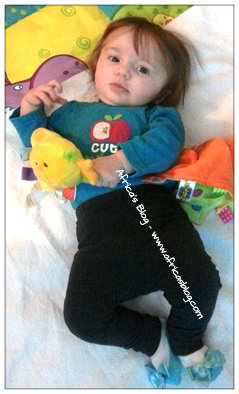 Here’s another picture of Gradie enjoying items she received from Special Baby Shower Gifts, the outfit, with matching blanket (this outfit includes the hemp baby shoes, but they’re not included in this picture). Make sure you take a look at Complete Outfits for Baby on their website, takes the hassle out of selecting individual items 🙂 . Also, the Croc Baby Socks Gift Set, which comes with 6 pairs of socks and a super soft croc plush toy, which Gradie just can not get enough of.