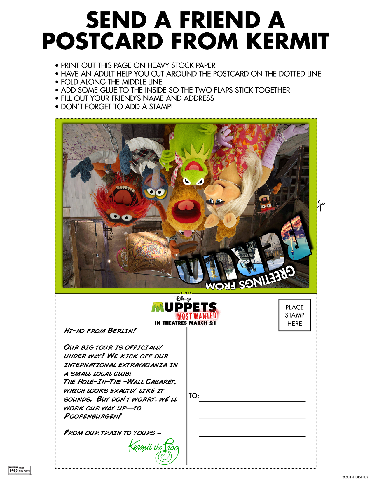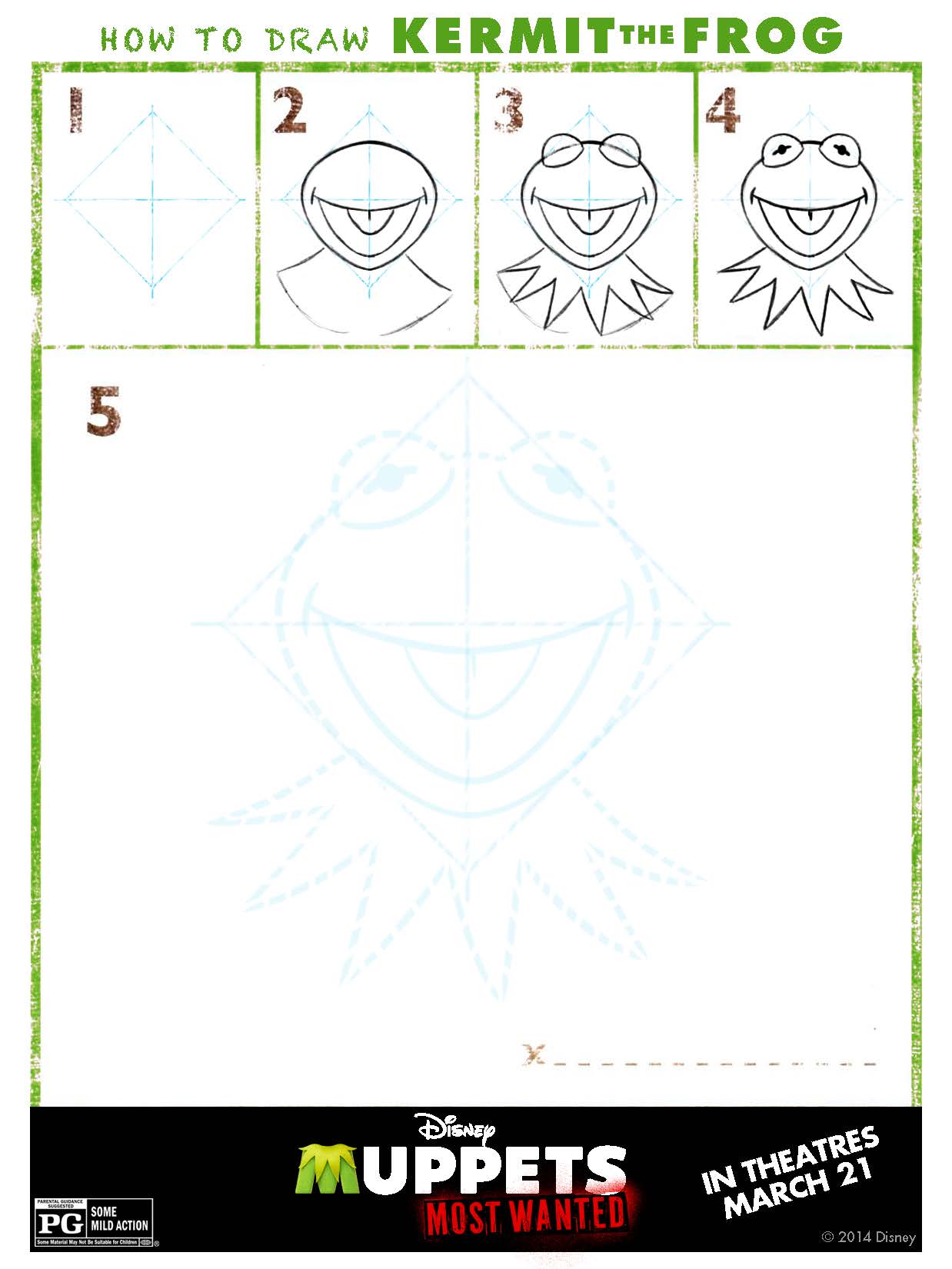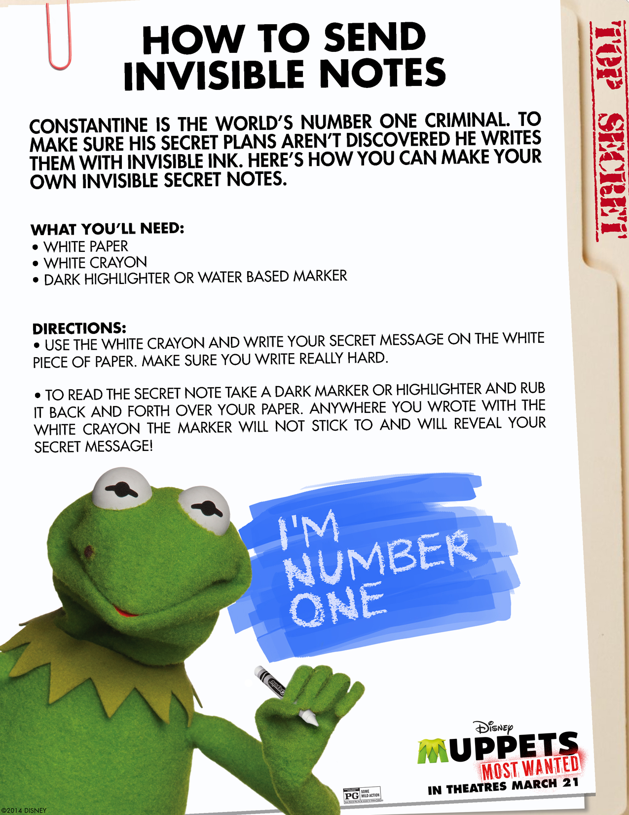 I had to share these for you and your children to enjoy!! Below please find activity sheets including how to send invisible notes, how to draw The Muppets, sending a postcard from Kermit and a really cool door hanger all on behalf of Disney’s MUPPETS MOST WANTED, opening in theaters in March!!