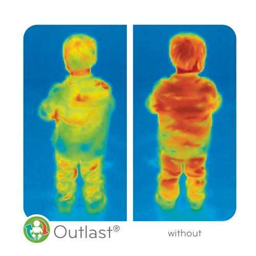 The infrared images above are taken of a child seated in two car seats. The first image reflects the child’s temperature with Outlast® performance fabric and the second image is the same seat but without Outlast® performance fabric. The red in the images represents heat, demonstrating that Outlast® technology has the ability to reduce overheating and prevent chilling, keeping children comfortable at a balanced temperature.