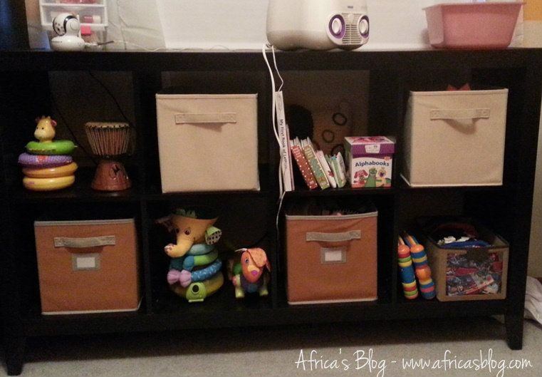 Looks pretty nice, wouldn’t you say? It fits (hides) most of her toys and her extra diapers which are beautiful to see on the shelves. And as she grows she will be able to choose her own books and pull off each soft tote full of fun things and with luck, put them back on the shelf 🙂 A MOM CAN DREAM, RIGHT??