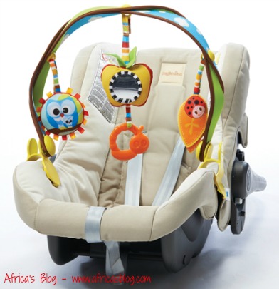 The Tiny Love Woodland Take-Along Arch is great and easily used from birth through 6 months (or more) of age. You can use it attached to your infant car seat or your stroller. It easily attaches and removes from both and it folds up small, which is really helpful to take along with while you travel this summer (see below).