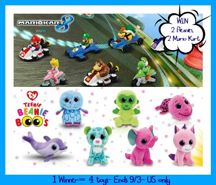 One lucky reader will win 4 toys- 2 Teenie Beanie Boos and 2 Mario Kart toys!