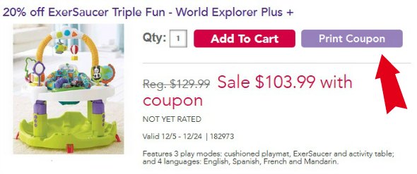 If you head to the Babies ‘R’ Us website between December 5-24 you can download an in-store coupon to save 20% off of the purchase price of $129.99 – after coupon you’ll pay just $104, an awesome deal you don’t want to miss!! See the screen print below –